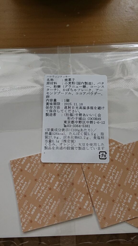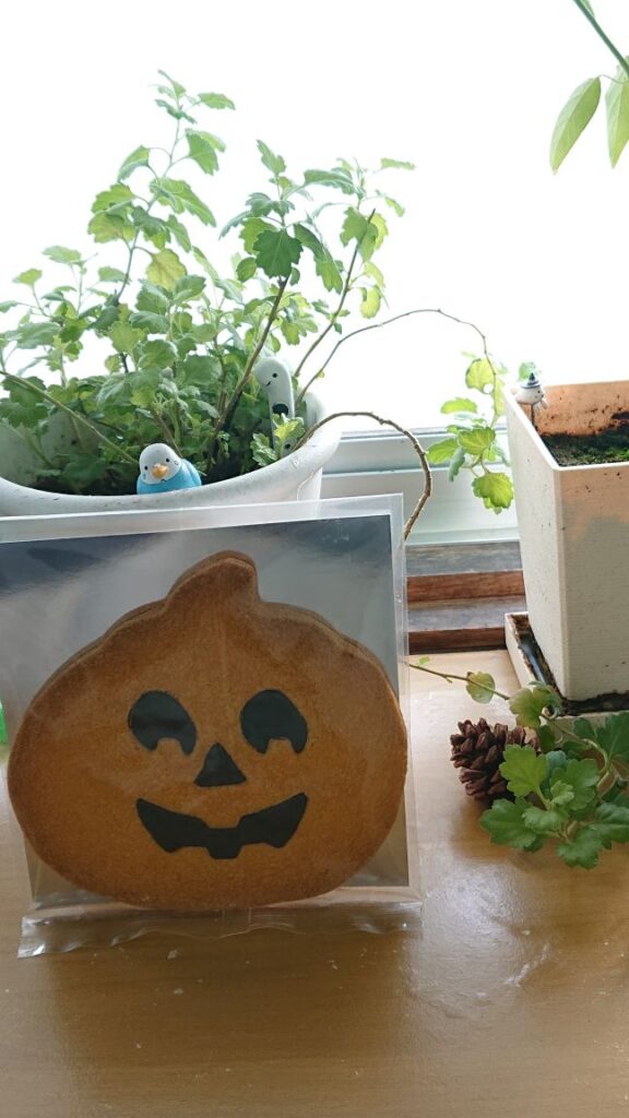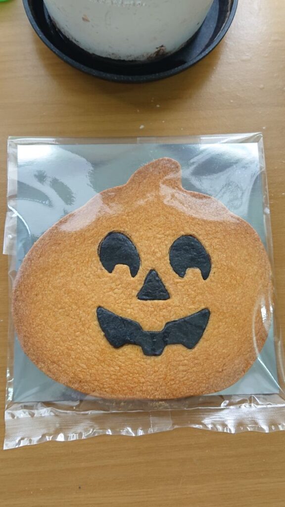 ちょくちょく寄る作業所にハロウィンメニューが出てたから覗いてみたら普段出てるお菓子の倍くらいする値段のクッキーあってさ、でかいんですかって聞いたら「このくらいですかねー」って大きめの肉まんくらいのサイズを手で示してくれたからそんならと思って他のお菓子と一緒に買って帰ってきて包みを開けてみたら緩衝材にくるまれてたってわけ