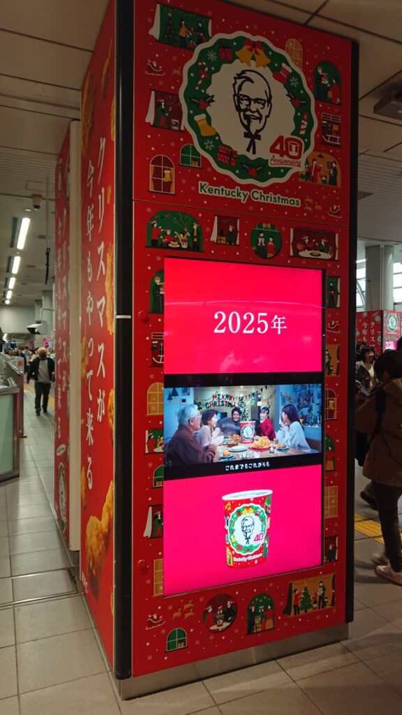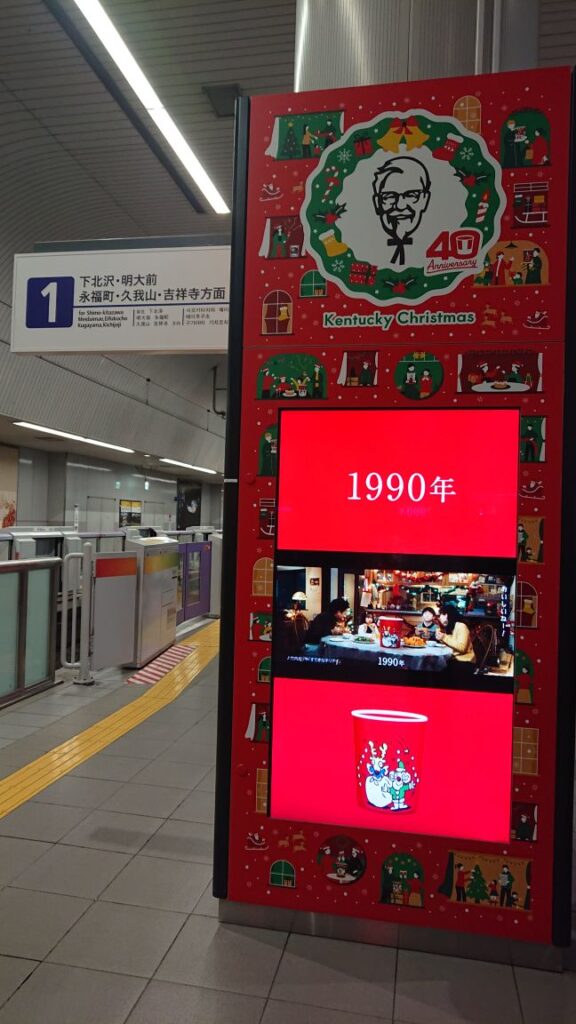 ホーム上のサイネージ広告はケンタッキーフライドチキン40周年